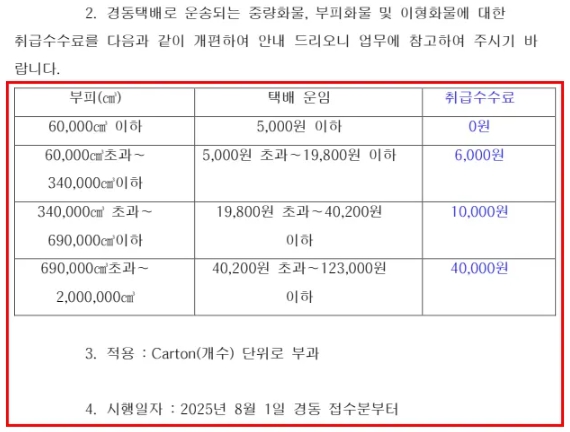 ✅ 중/대형 화물 OR 이외의 사유로 화물택배로 이관될 경우, 별도의 추가 운임이 발생합니다.